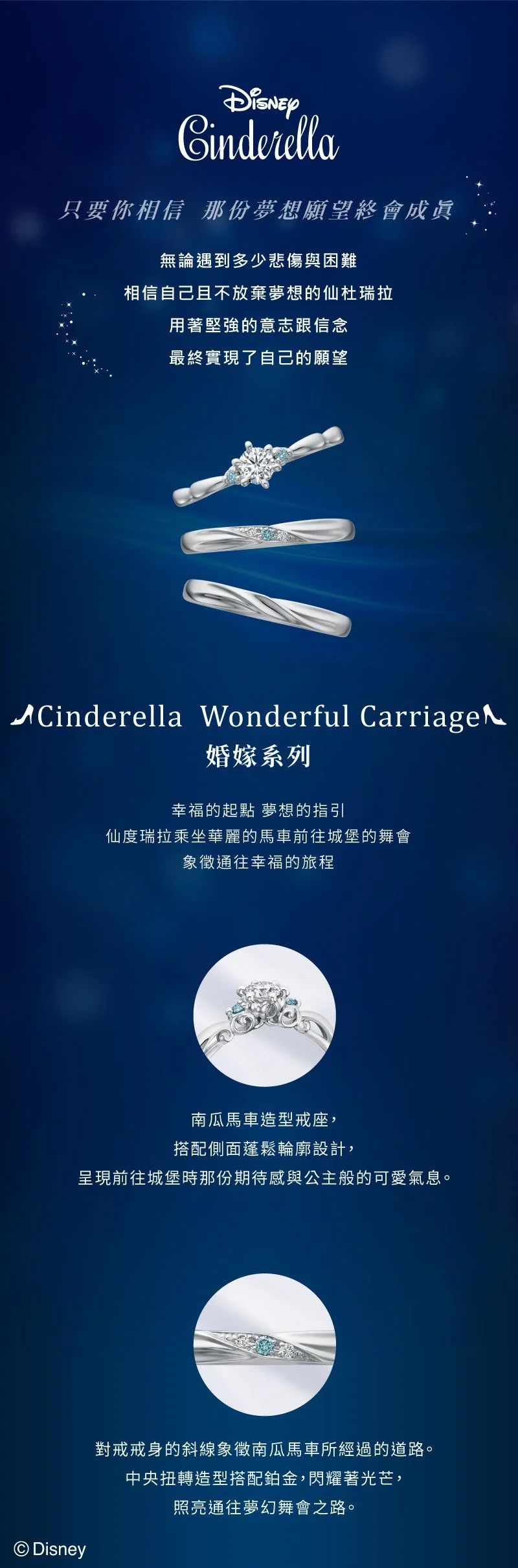 仙度瑞拉乘坐華麗的馬車,前往城堡的舞會,象徵通往幸福的旅程。