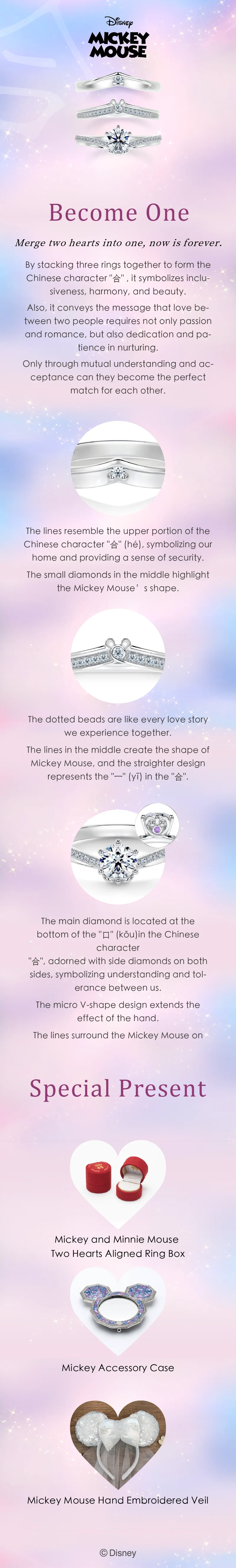 The Mickey Mouse hearts on the side of the diamond ring are like the dreams we chase together, allowing us to etch every ordinary yet precious moment of our daily lives in this beautiful home.