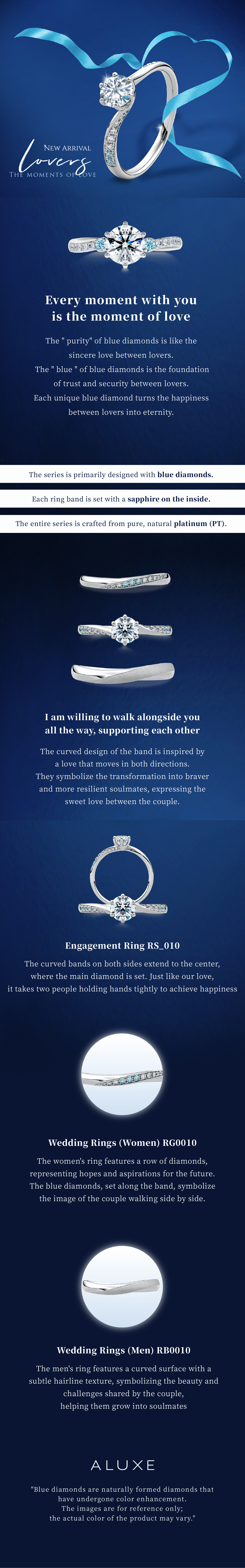 The matching rings feature a streamlined design that symbolizes a love journey where both sides meet each other halfway. The man's ring has a calm brushed texture, while the woman's ring is adorned with diamonds, representing hopes and dreams for the future. The blue diamonds symbolize the couple walking side by side, experiencing both joys and challenges together, while each shines in their unique way.